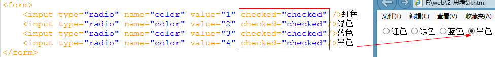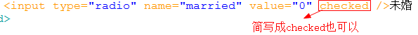 - checked属性用来默认选择单选按钮,简写成checked也可以