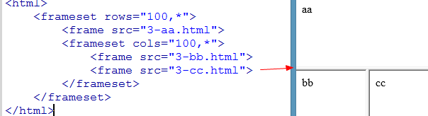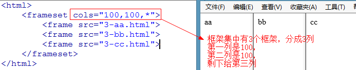 例题二:在浏览器上显示3个框架,他们分成3列,如下格式: