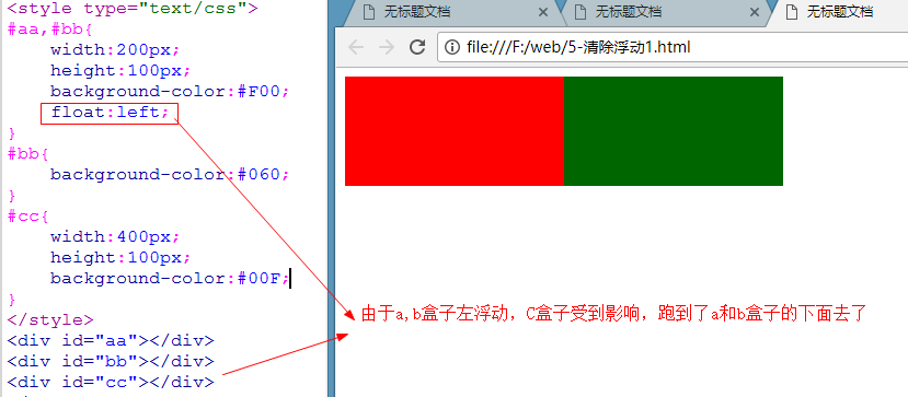 解决方法:在上下的盒子之间插入一个空div,专门用来清除浮动的影响。