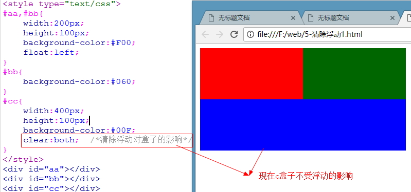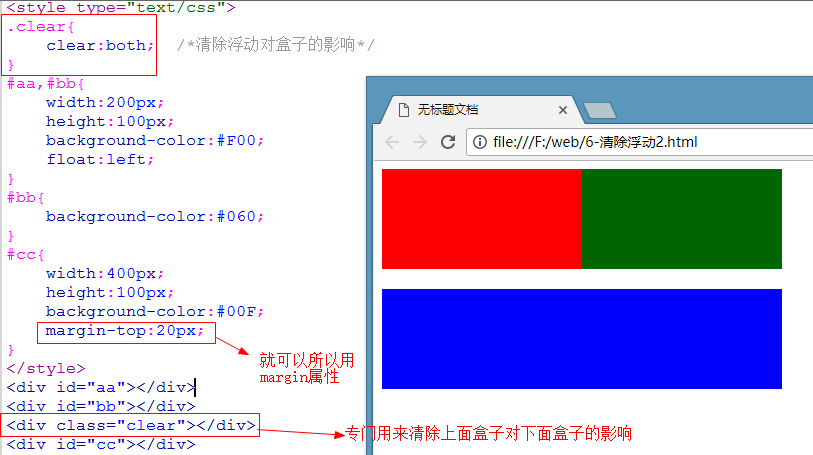 多学一招:Clear属性不但能清除float属性,还能清除margin属性,如果用了clear属性的盒子就不能再使用margin属性。