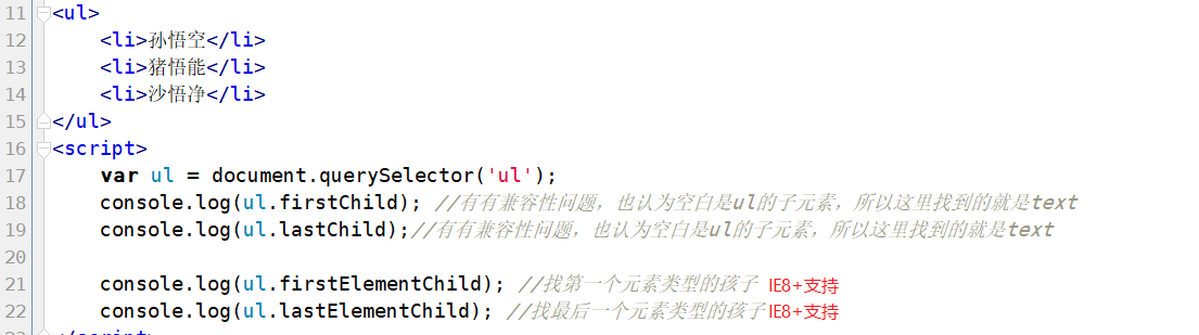 firstElementChild lastElementChild :只查找元素类型的子节点,不会计算空白,但是在IE8+才支持