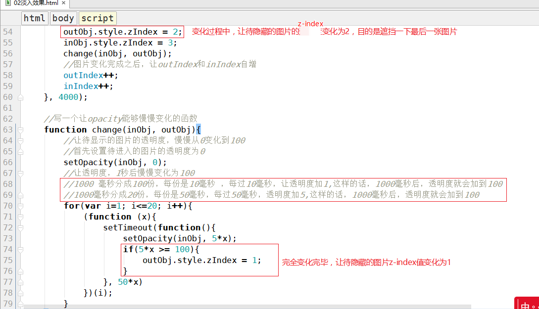 变化过程中,待显示的图片的透明度还没有达到1,也就是半透明状态,而其他图片的z-index值又都为1,z-index值相同的话,默认总是显示最后一张。