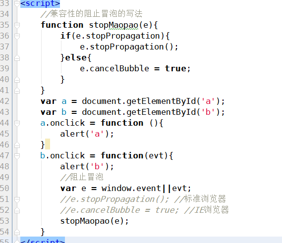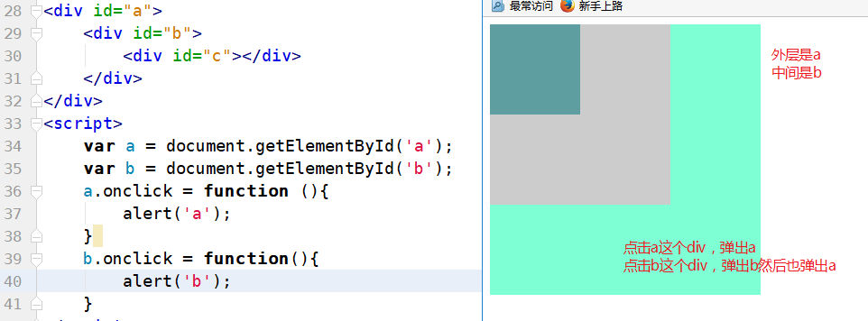 在点击b这个div的时候,由于b在a的上面,也相当于点击了a。所以会触发两个事件,这种情况就是冒泡事件。