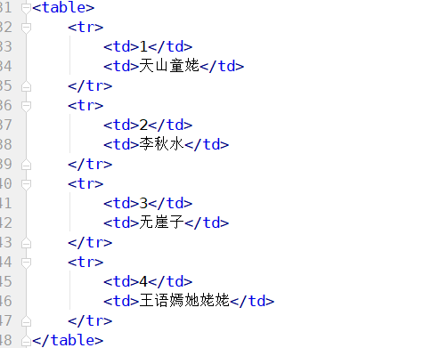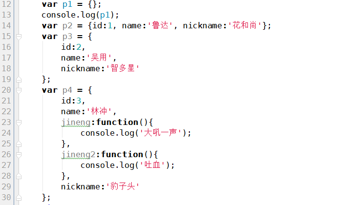 [{id:1, name:’宋江’, nickname:’及时雨’}, {id:2, name:’卢俊义’, nickname:’玉麒麟’},{id:1, name:’林冲’, nickname:’豹子头’}]