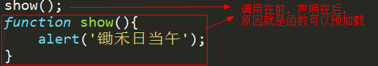函数有预编译(预加载)的过程,可以实现调用在前,声明再后。在编译的时候先把函数编译好放在内存中,在执行JS的时候函数其实已经编译好了,所以直接调用就可以了。