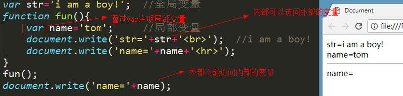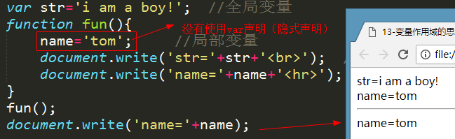 总结:在函数中,通过var声明的变量是局部变量,不用var声明的变量在全局变量。