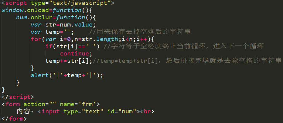 思路:声明一个变量用来保存结果字符串,遍历循环字符串,如果不是空格就保存到变量中。最后这个变量就是去掉空格的字符串。