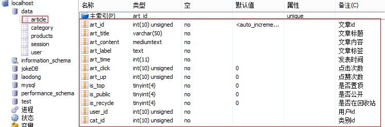art_id int unsigned auto_increment primary key comment ‘文章id’,