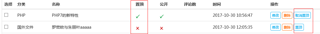 $sql= ‘select a.art_id,a.art_title,a.is_top,is_public,c.cat_name,a.art_time from article a,category c where a.cat_id=c.cat_id and is_recycle=0 order by is_top desc,art_id desc’;