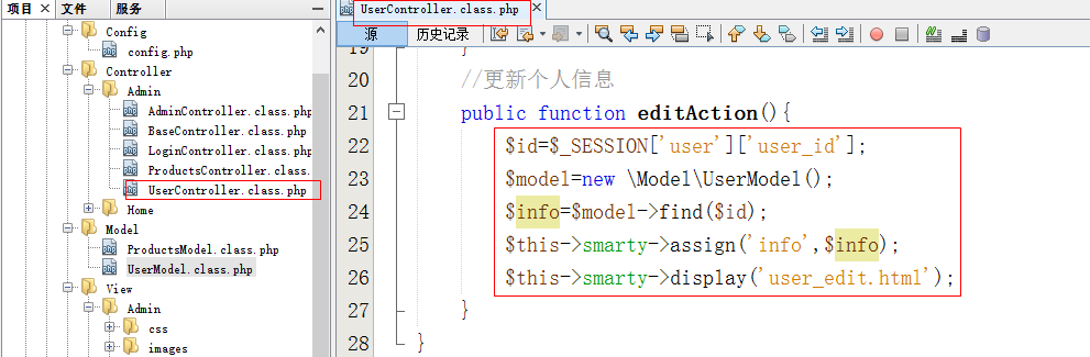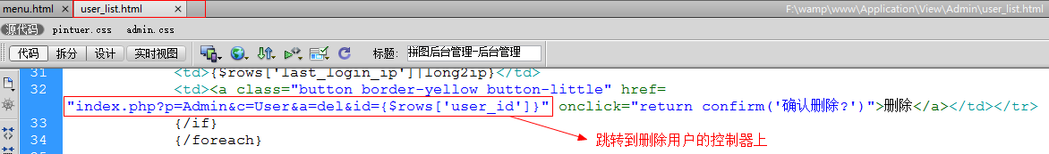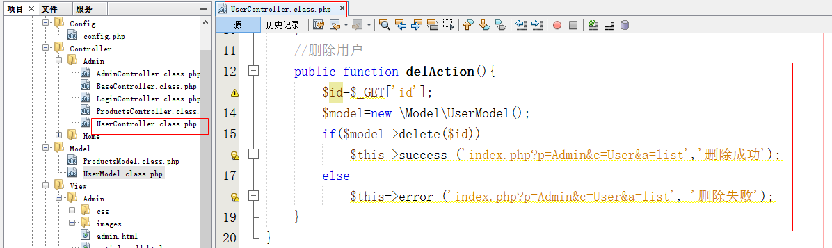 - 在UserController.class.php页面中,添加接受删除用户的请求