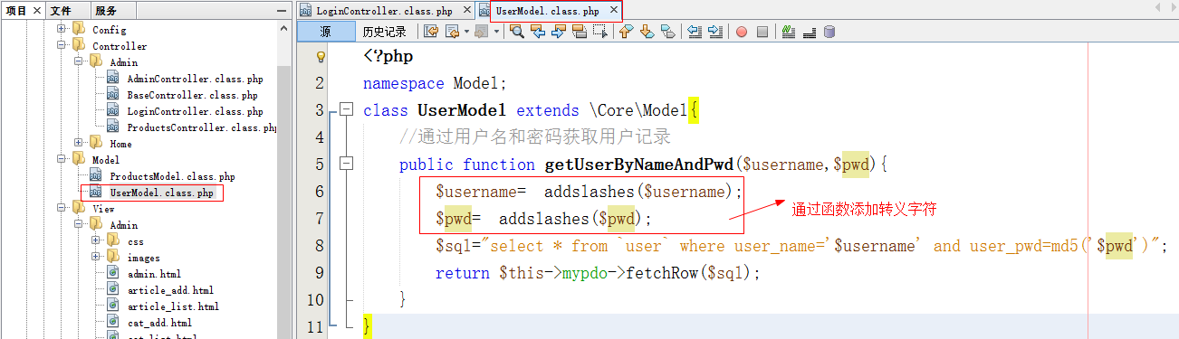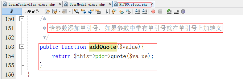 - 在MyPDO中添加addQuote()方法,pdo->quote()用来给参数添加单引号,如果参数本身带有单引号则添加转义。