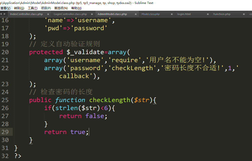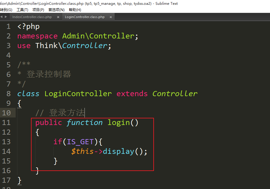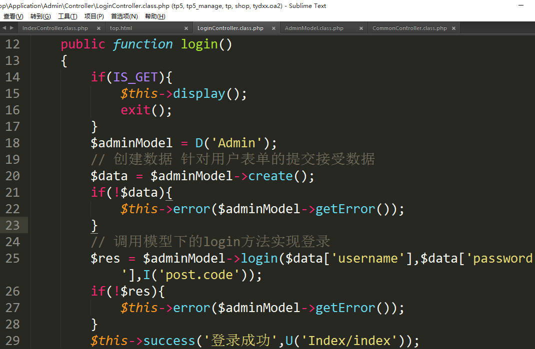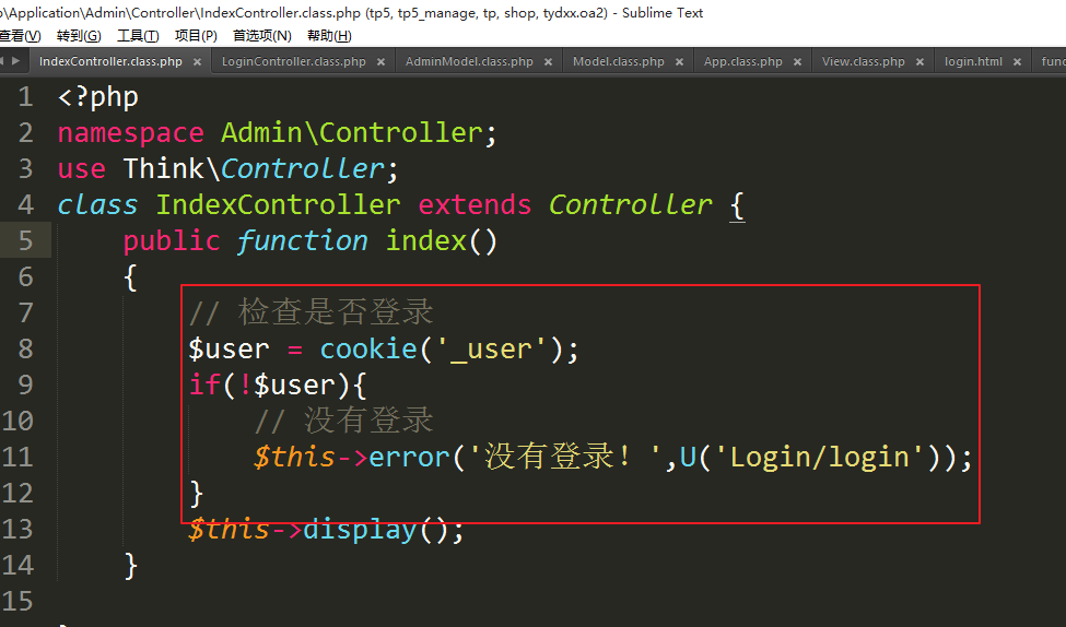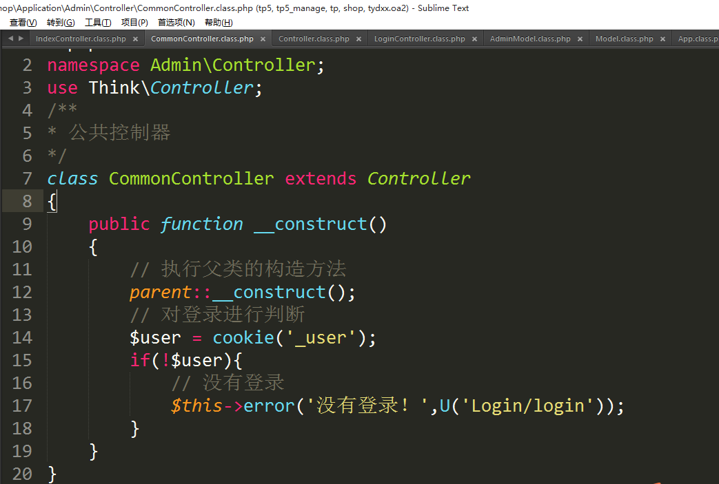 对于此方式,由于后台中除了登录之外。其他的都需要进行是否登录判断。此方式不合理。可以在创建一个公共控制器在构造方法中进行验证。对于除了登录控制器之外其他的控制器都继承公共控制器