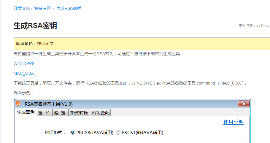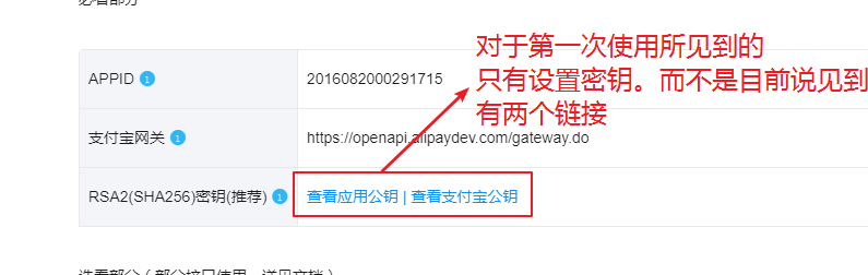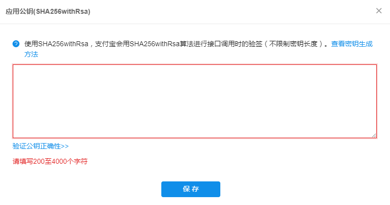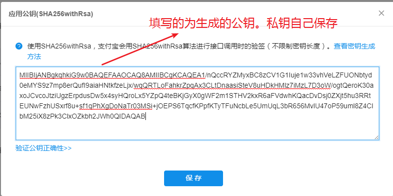 可以点击密钥生成方法查看如何填写密钥信息地址:https://docs.open.alipay.com/291/105971