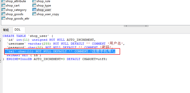 `tel` char(11) NOT NULL DEFAULT ” COMMENT ‘联系电话’,