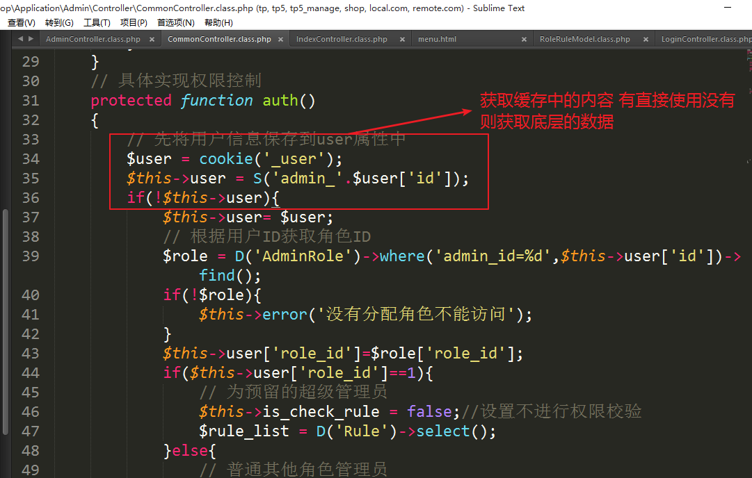 由于权限认证处理是在公共控制器中的构造方法中实现。对于每一次访问方法都需要走权限认证。而权限认证涉及多次的数据库的查询操作。因此影响数据库性能。可以使用缓存解决问题