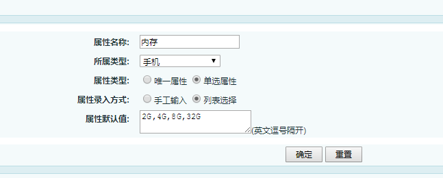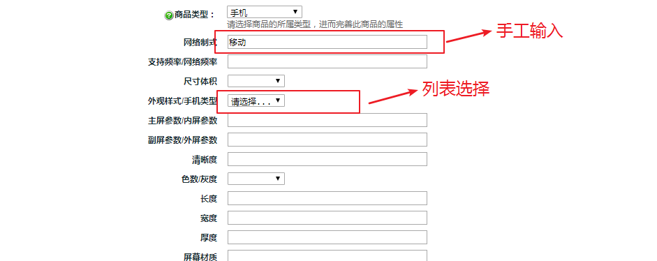 关于属性的录入方式就是当描述商品时对应的内容,是使用选择框(列表选择)还是文本框(手工输入)
