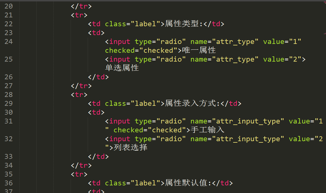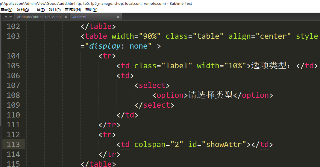 ②增加商品属性选项卡对应的table