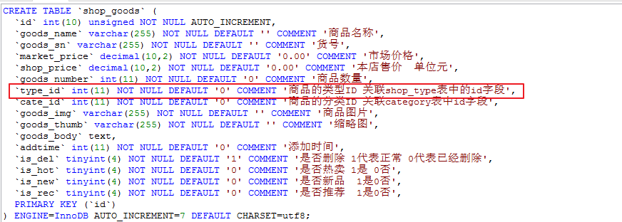 `type_id` int(11) NOT NULL DEFAULT ‘0’ COMMENT ‘属性的所属类型 对应shop_type表中的id字段’,