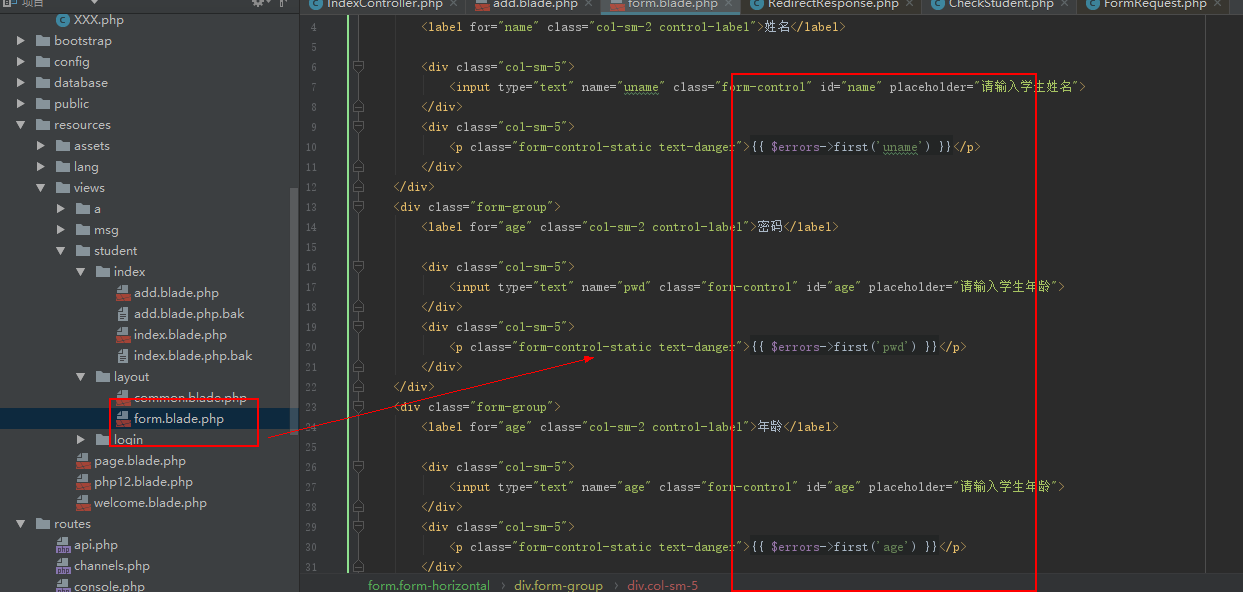 <form action=”{{ url(‘student/add’) }}” class=”form-horizontal” method=”post”>