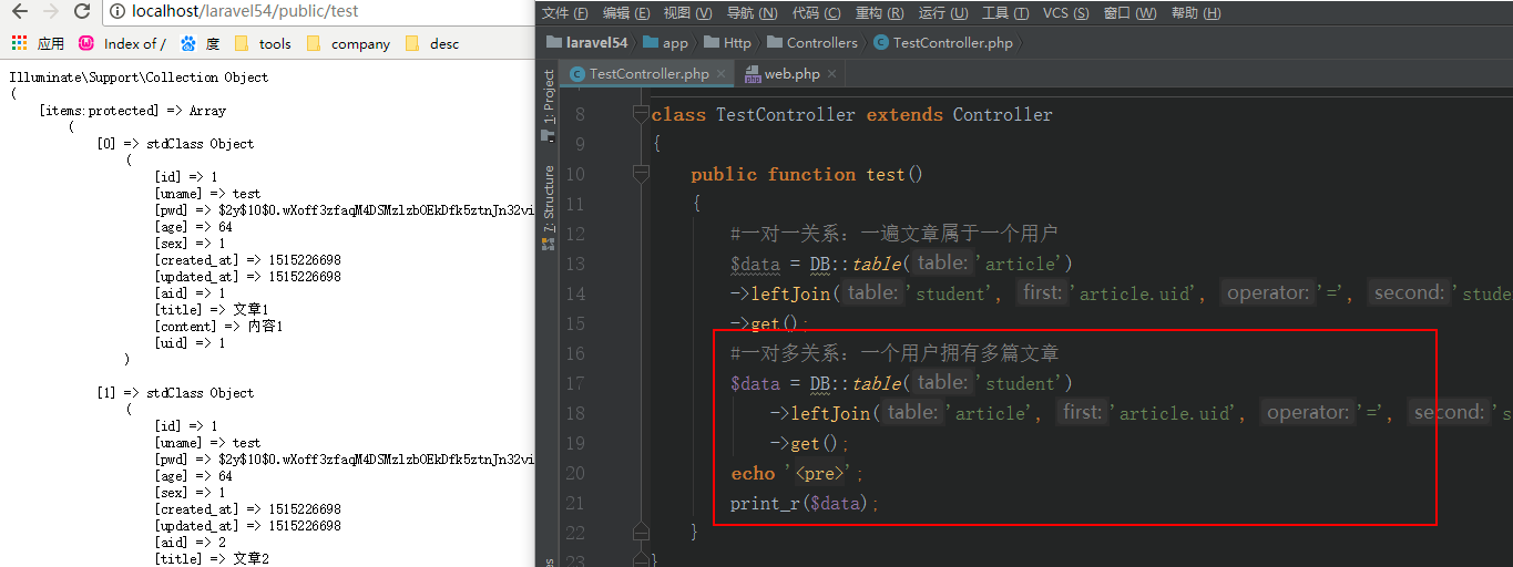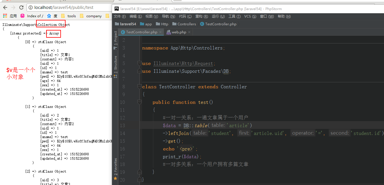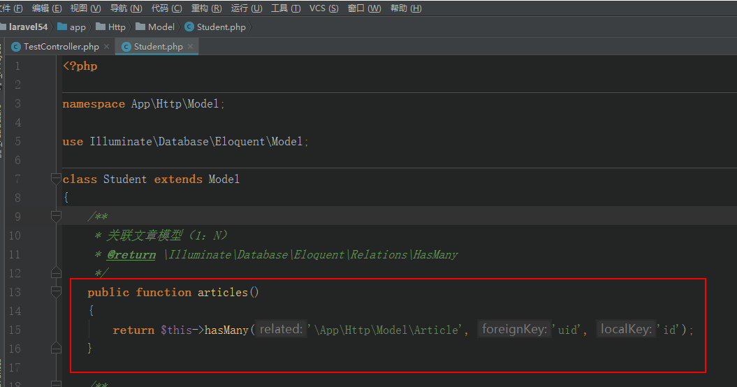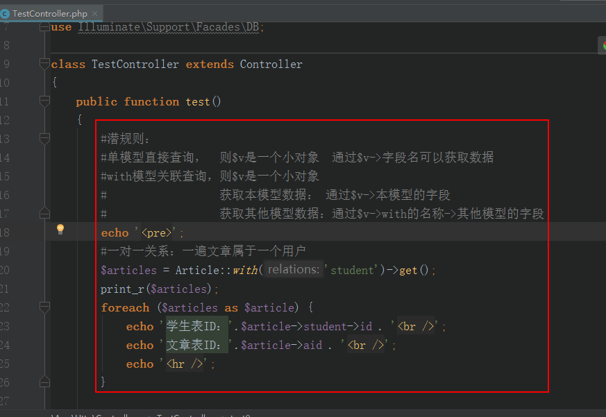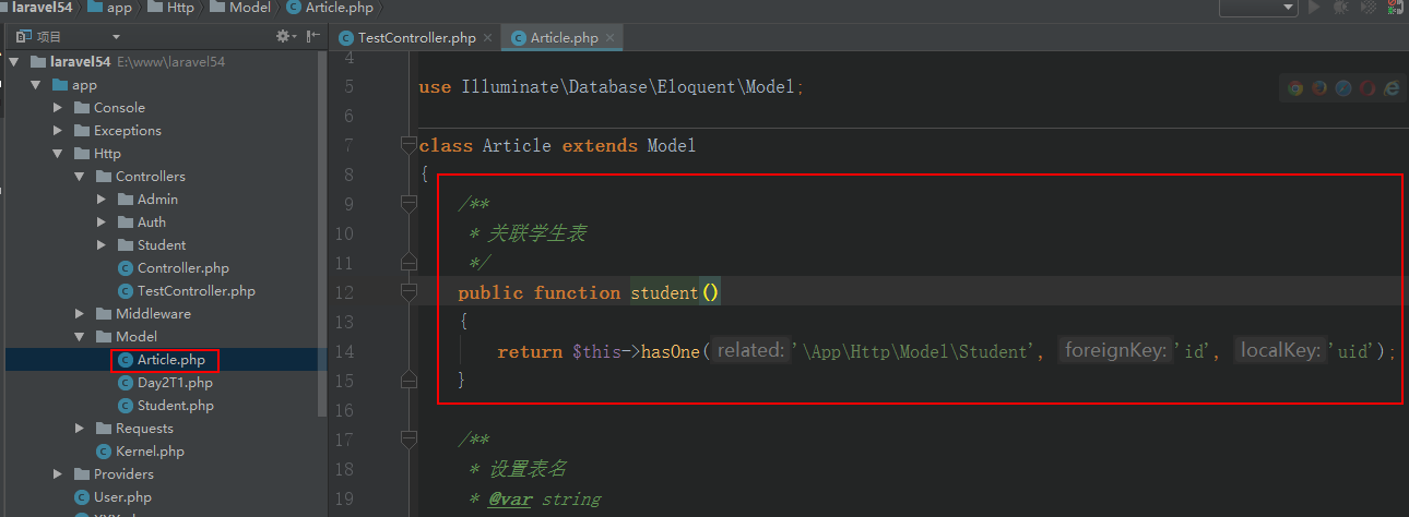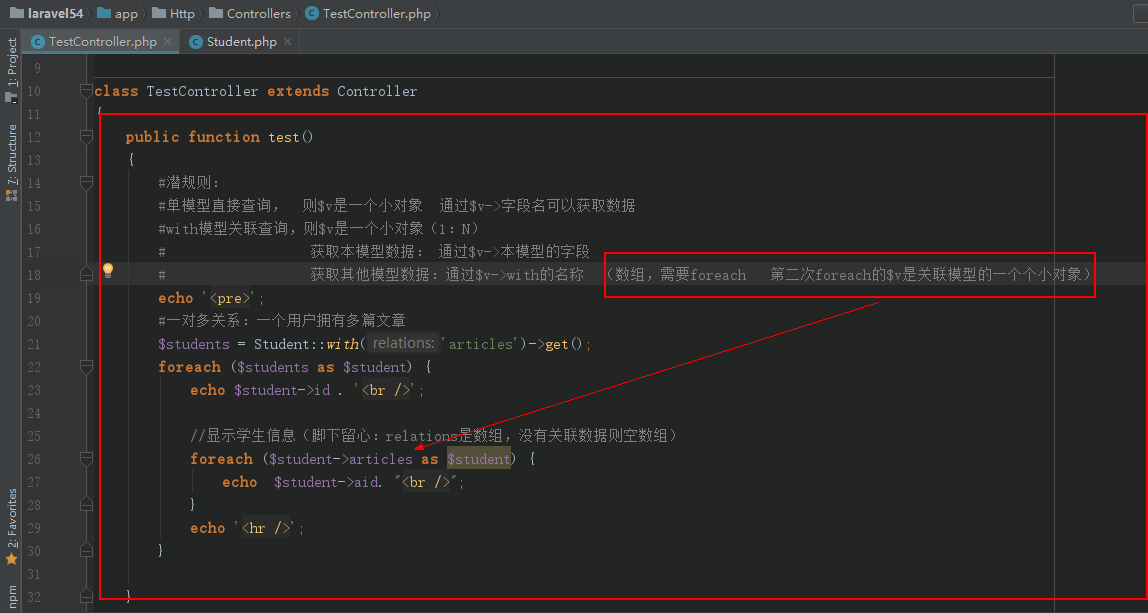 echo ‘学生表ID:’.$article->student->id . ‘<br />’;