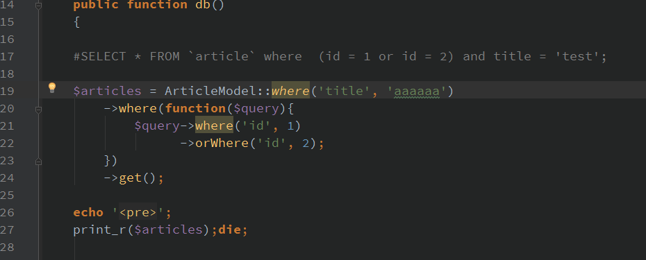 echo ‘文章表ID:’.$article->aid . ‘<br />’;