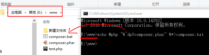 【echo @php “%~dp0composer.phar” %*>composer.bat】后发现www目录下新增了.bat文件将其加入环境变量即可
