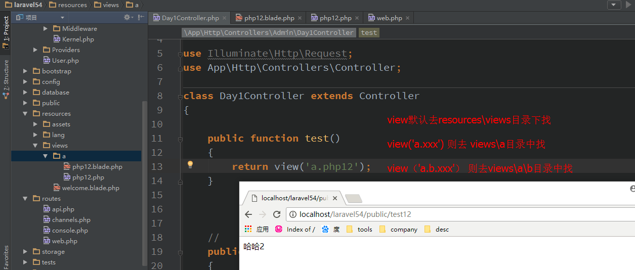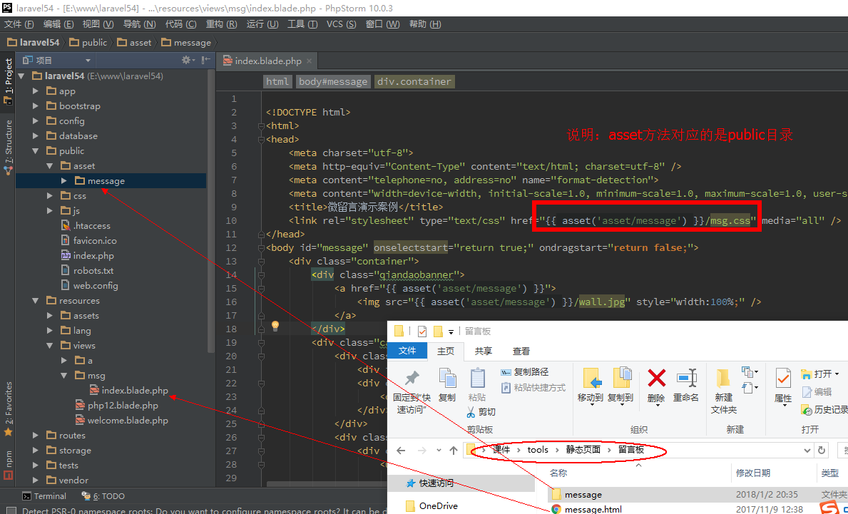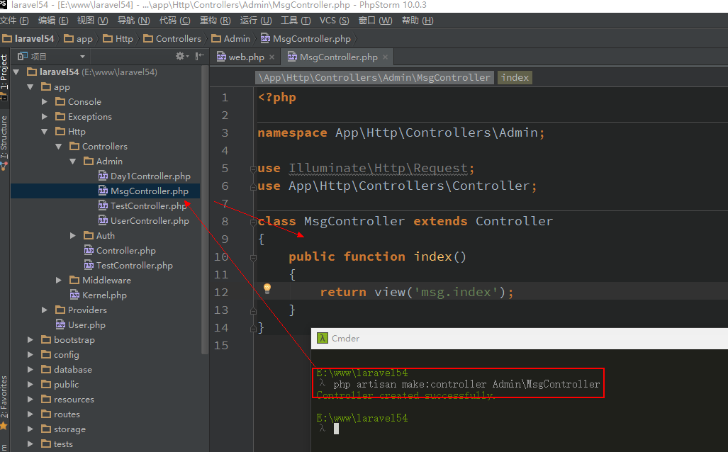 - 步骤2:创建控制器MsgController和方法index 并且调用视图