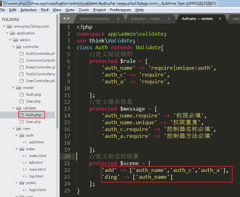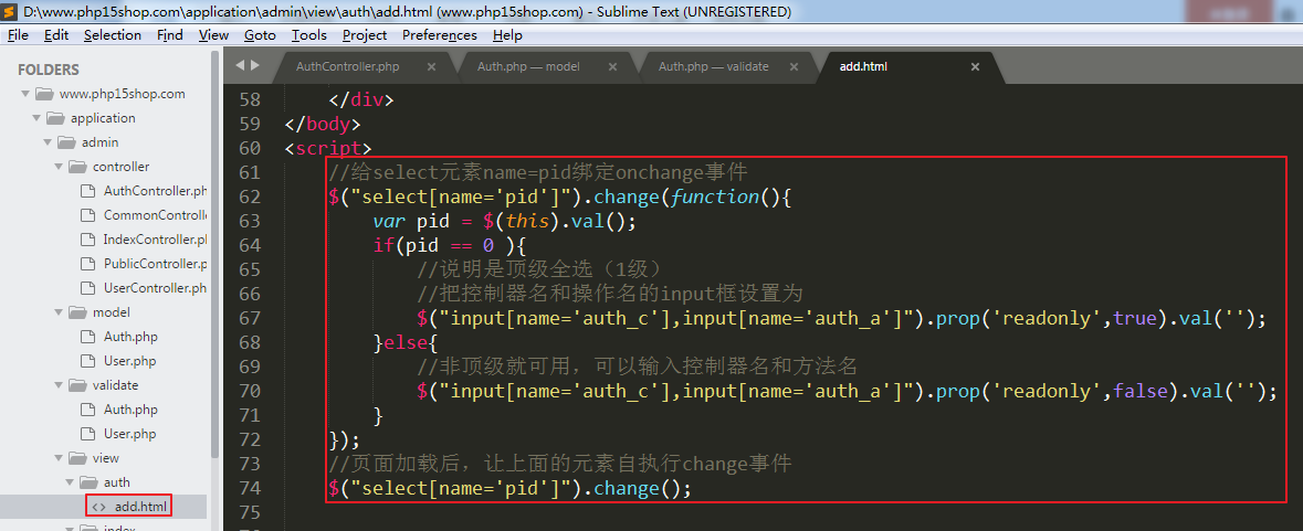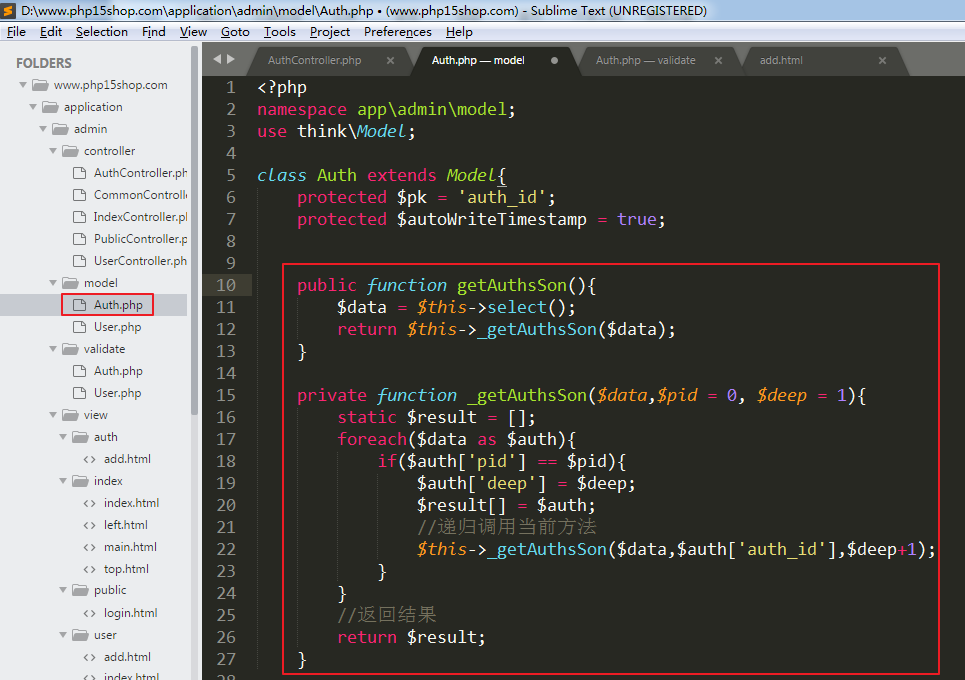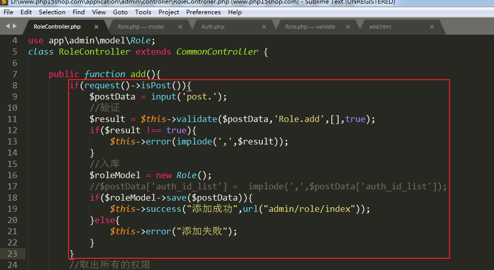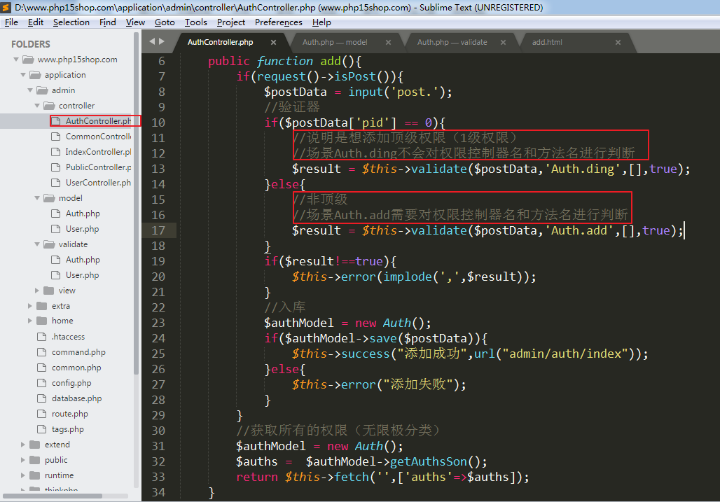 步骤1:在后台建立一个Auth控制器,并建立一个add方法,输出模板内容,并完成添加权限的实现