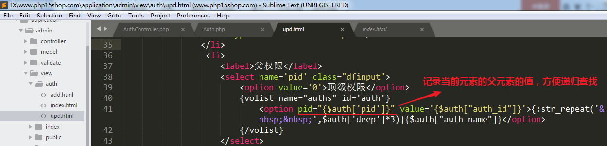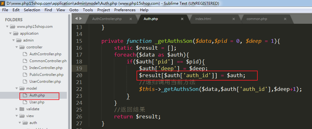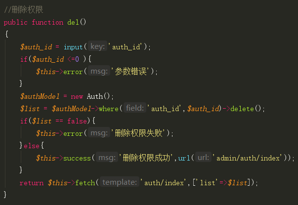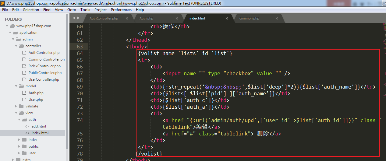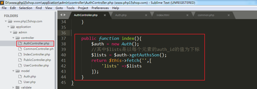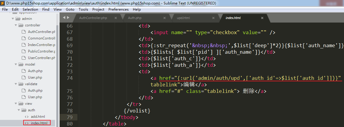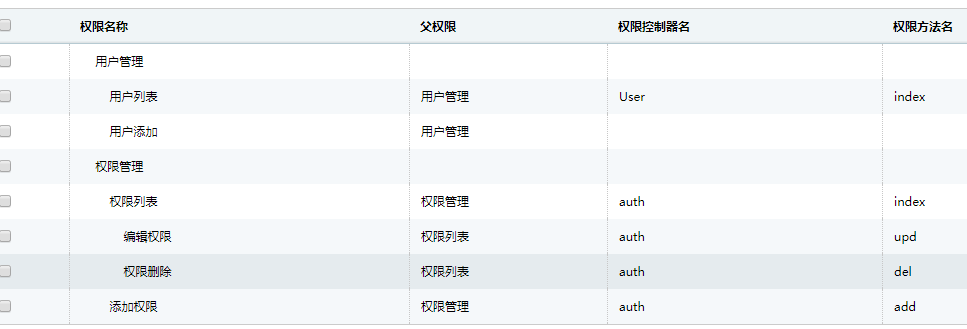 步骤1:在后台的Auth控制器中建立一个index方法,取出所有的权限数据,分配到模板中。