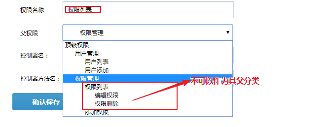 a、不能以当前分类作为父权限 b.不能以当前子孙作为父权限