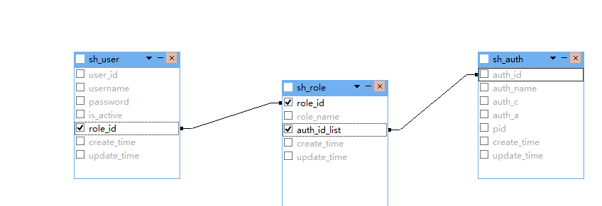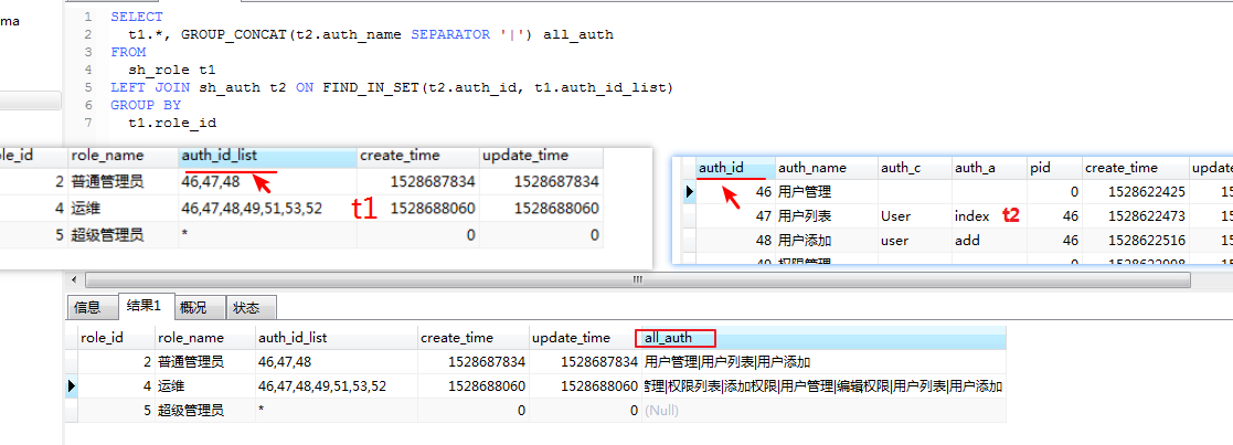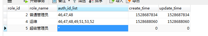 • 角色表通过所拥有的所有权限字段auth_id_list,找到与其关联的权限表的auth_id。