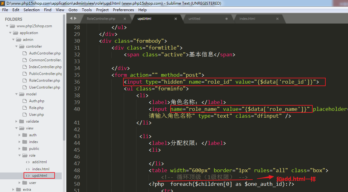 步骤1:在后台建立一个Role控制器,并建立一个add方法,获取所有的权限