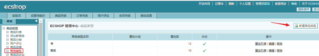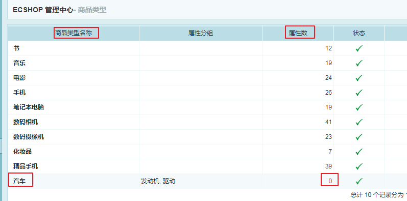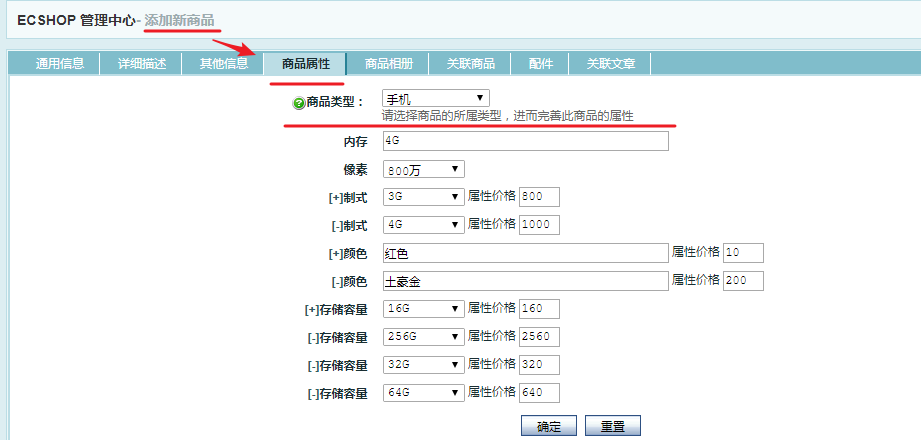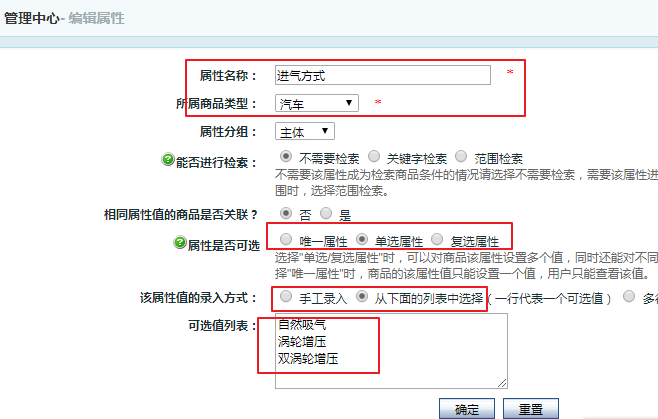 可以在ecshop后台中新建一个商品类型,如下:建立一个汽车商品类型