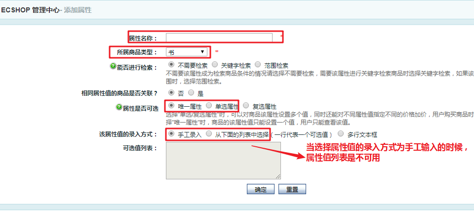 手工输入:不可以输入属性值,且可选值列表是禁用状态,只能在添加商品的时候输入属性值。