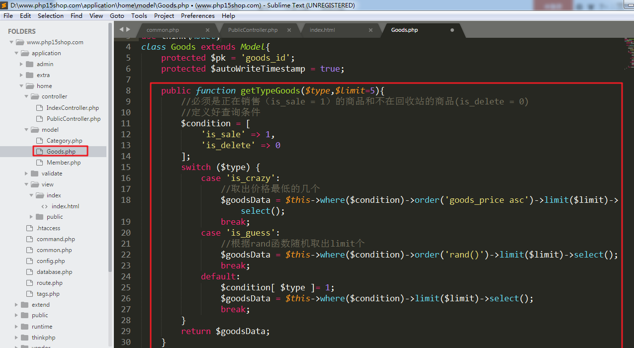- 在home-Goods模型中定义一个获取指定类型商品的getTypeGoods方法