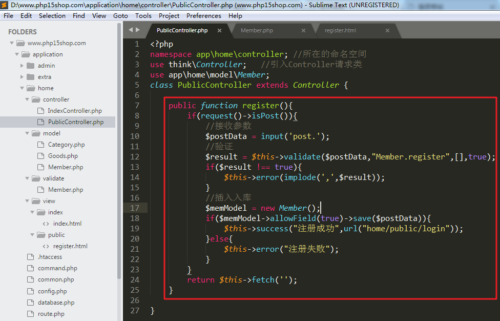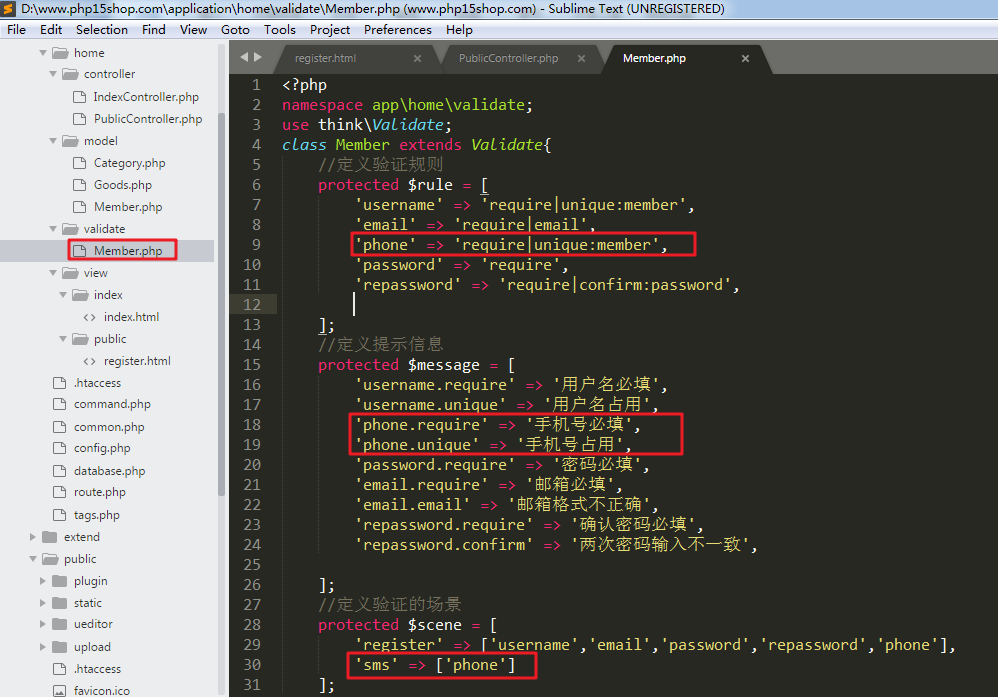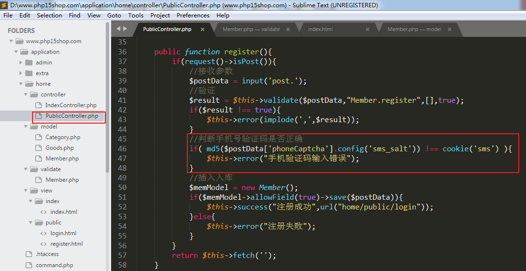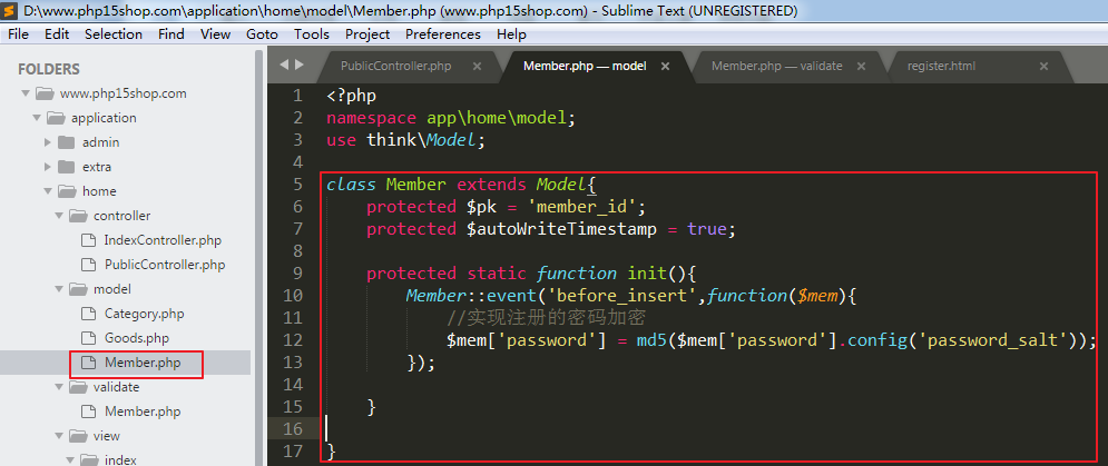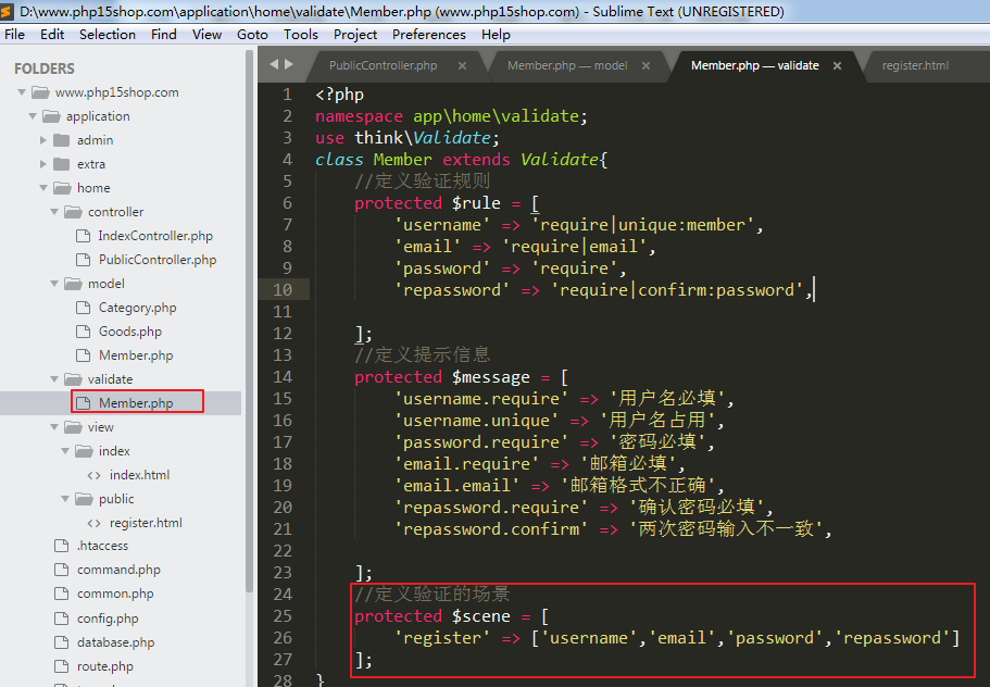 - 在Member模型中定义一个checkUser方法,判断用户名和密码是否正确