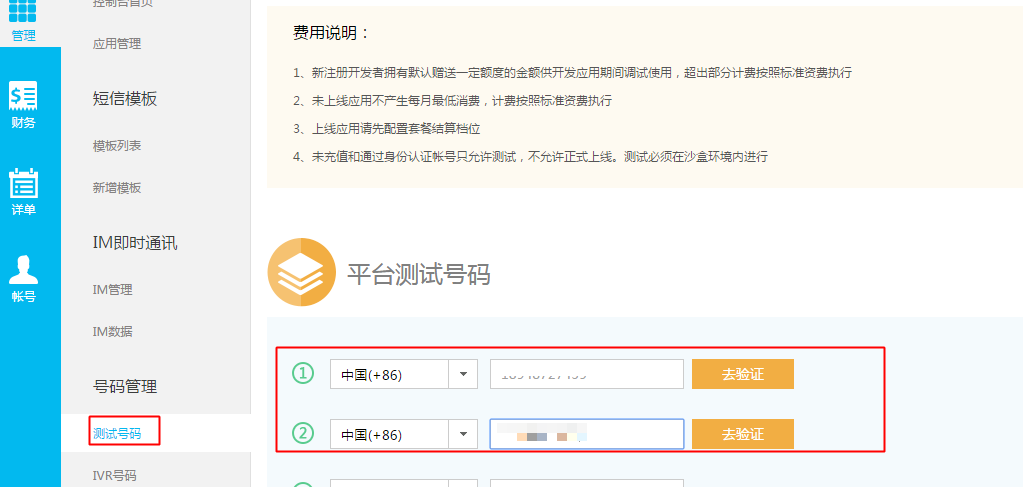 注意:只有填写测试的手机号才可以发送短信,通过身份证认证之后无限制。