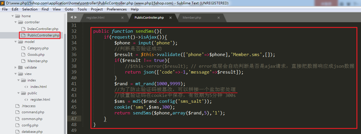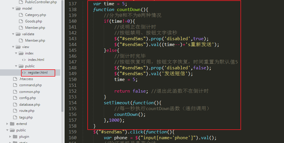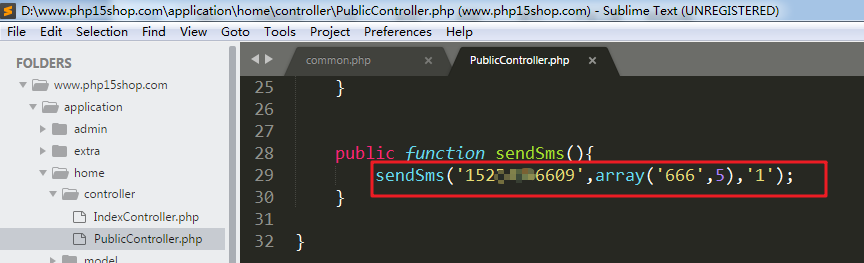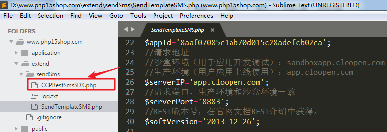 - 上面演示代码放在虚拟主机中测试如果可以正常发送短信则把对应的文件夹sendSMS复制到我们[项目目录]/extend/目录下面: