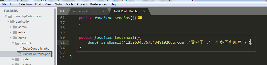 - 在common.php文件中封装一个发送邮件的方法sendEmail