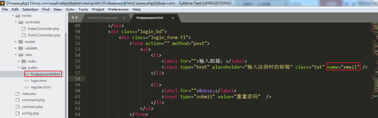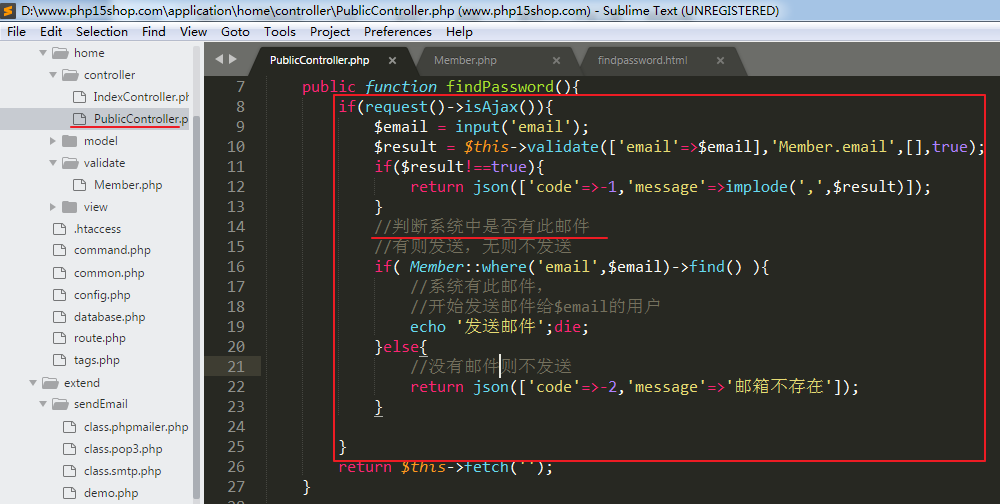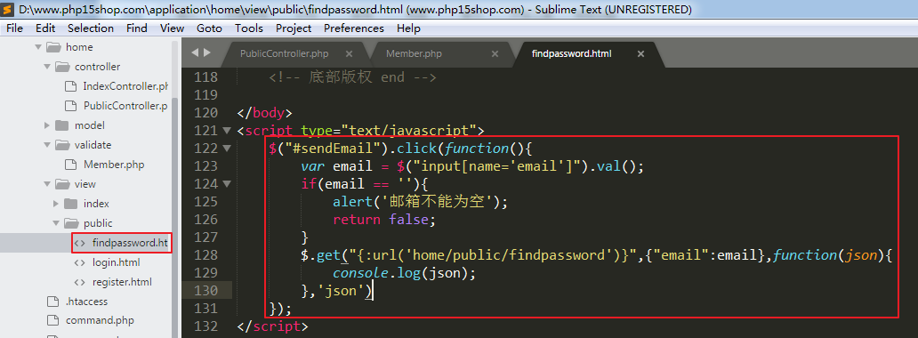 - 在home模块的PublicController控制器中的findPassword方法中判断是否是ajax请求,接收重置的邮箱,进行一些发送邮件前的判断
