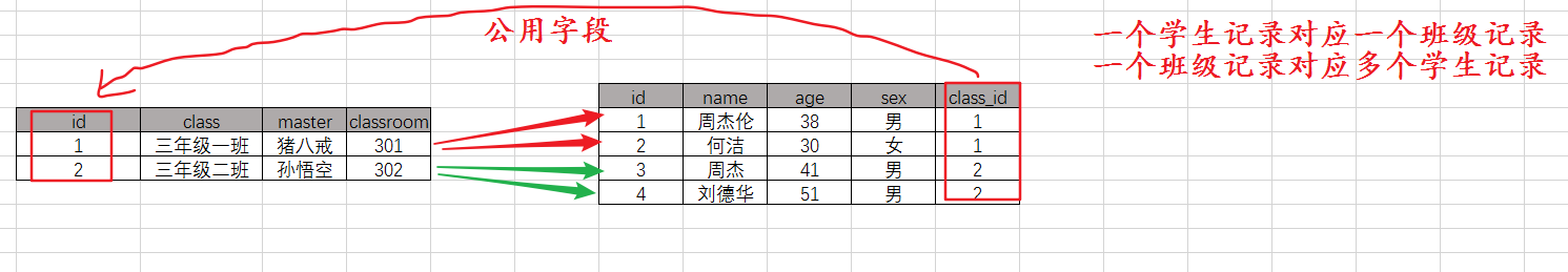 内连接:只返回满足条件 (公用字段班级id相同的)记录横向连接的结果