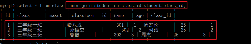 Select * from class right join student on class.id=student.class_id;