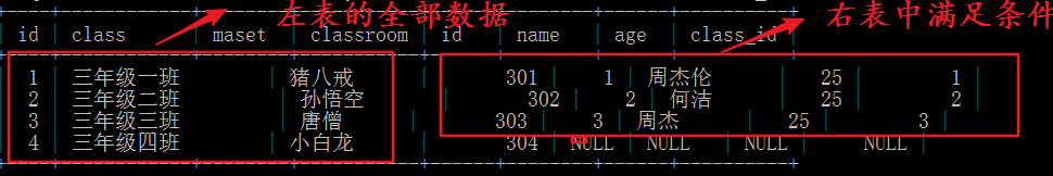 select * from class left join student on class.id=student.class_id;