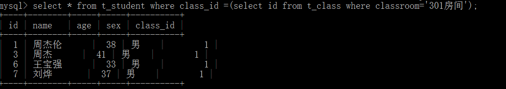 select * from t_student where class_id =(select id from t_class where classroom=’301房间’);