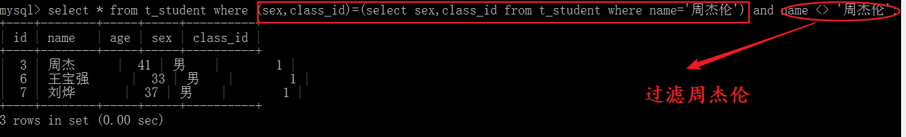 select * from t_student where (sex,class_id)=(select sex,class_id from t_student where name=’周杰伦’)