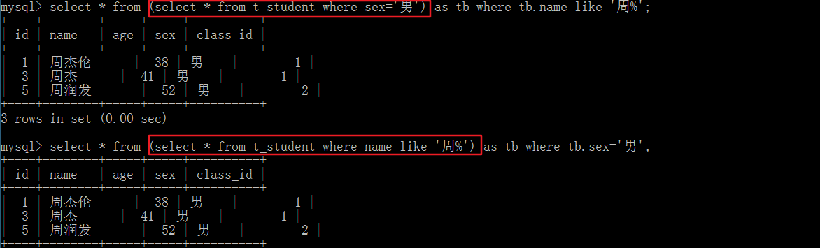 select * from (select * from t_student where sex=’男’) as tb where tb.name like ‘周%’;