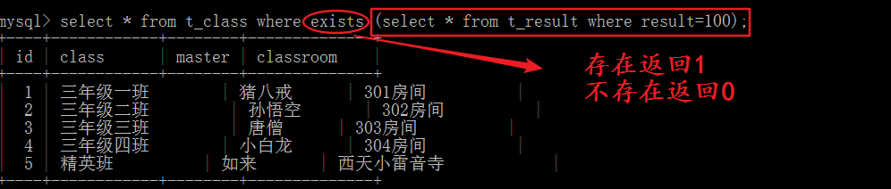 select class from t_class exists (select * from t_result where result=100);