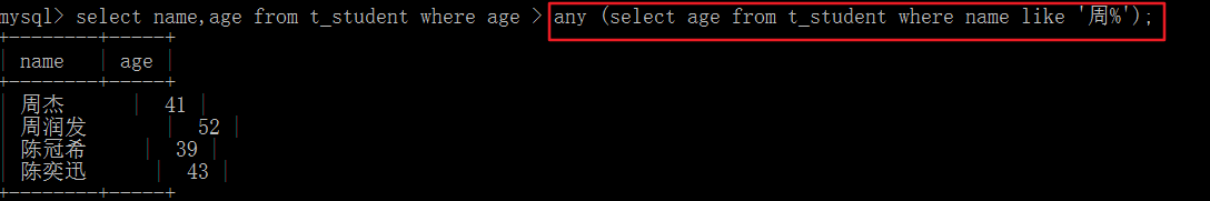 select name,age from t_student where age > any (select age from t_student where name like ‘周%’);