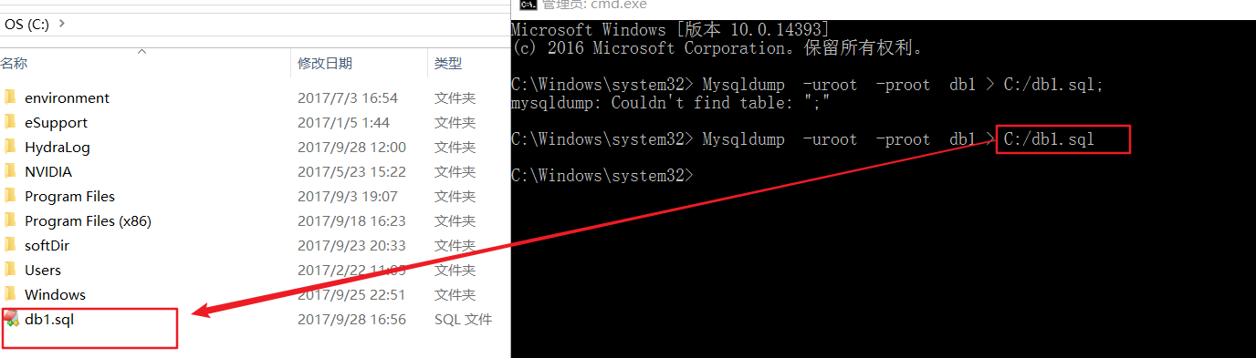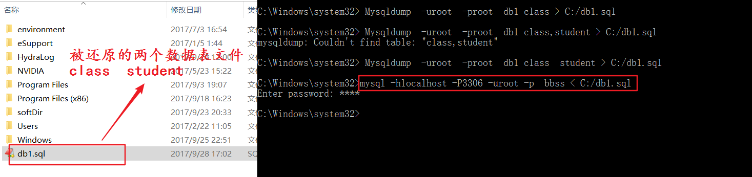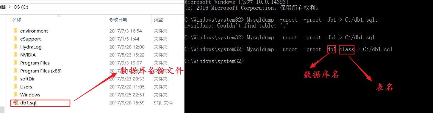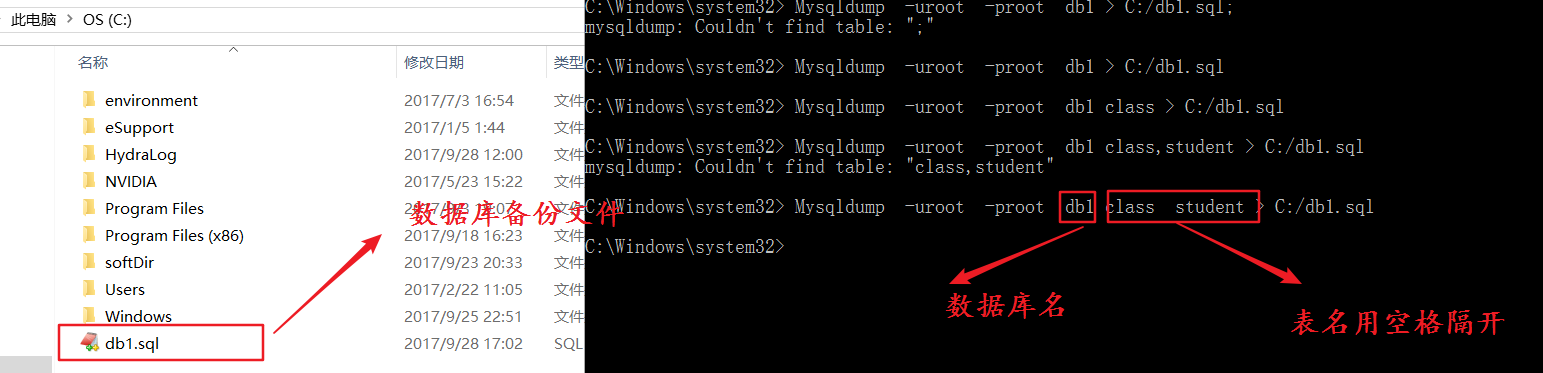 Mysqldump -uroot -proot db1 >C:/db1.sql;