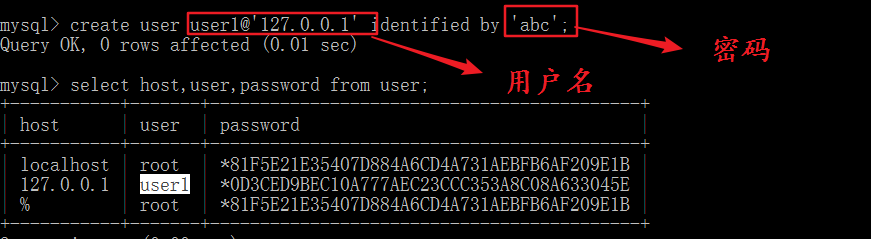 Create user user1@’主机地址’ identified by ‘密码’
